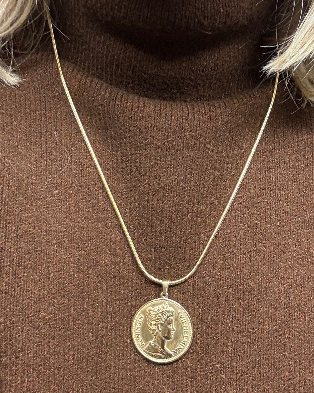 Throwback maar dan on point. Deze goudkleurige 5 gulden munt ketting is jouw nieuwe go-to voor elke dag. De munt heeft twee verschillende kanten (love that!), dus de hanger ziet er altijd interessant uit — zelfs als ‘ie draait.